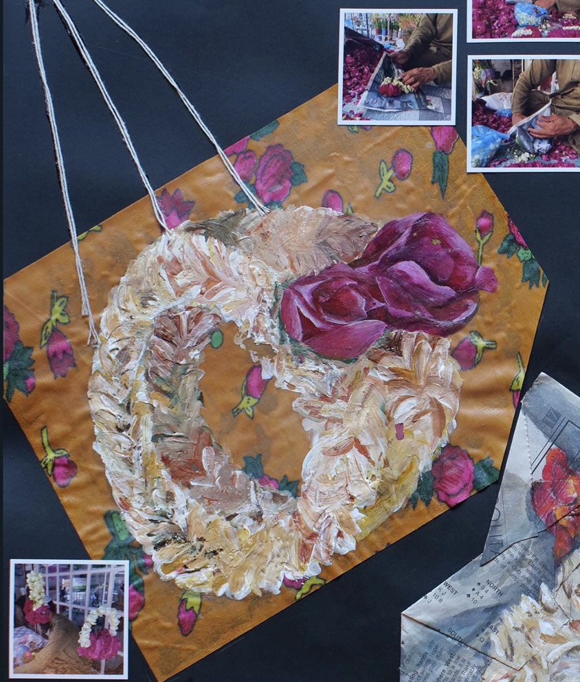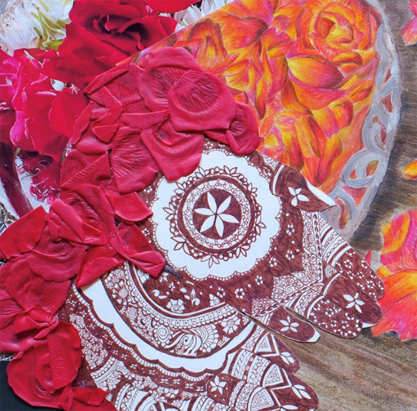 used mixed media, colour pencils, pen and artificial rose petals to create a “thaal” (platter) which