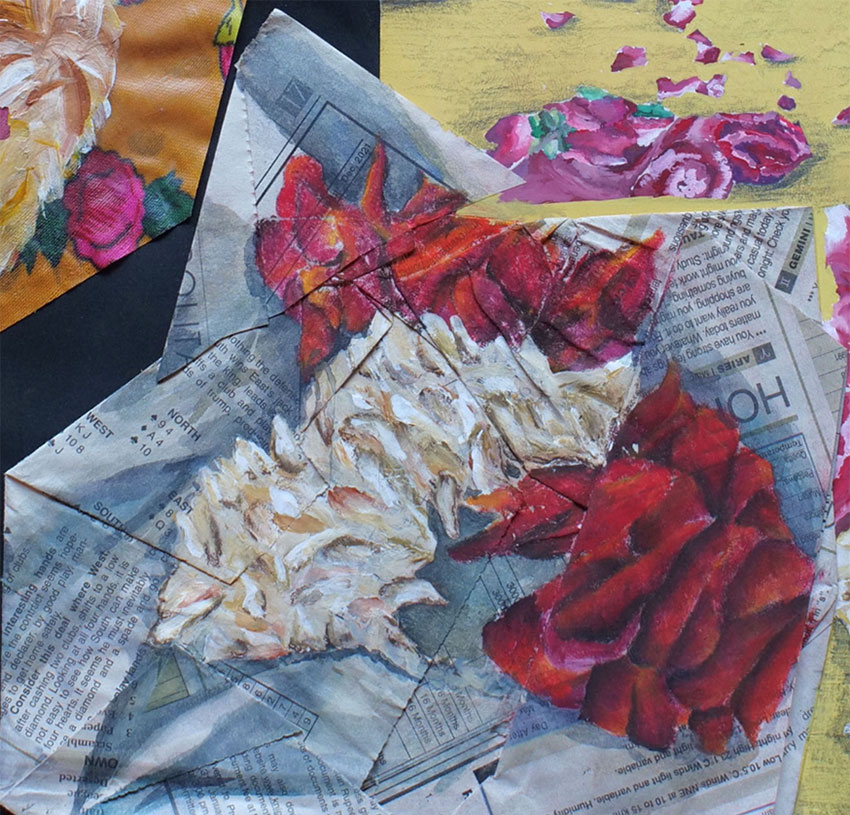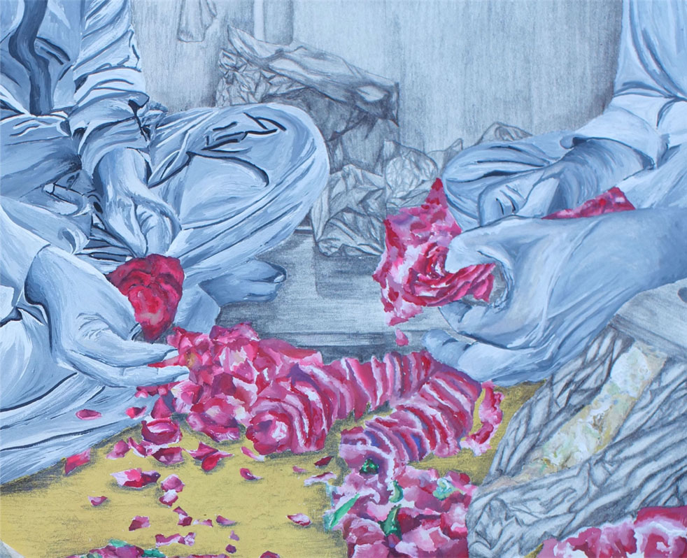 Mix media on paper, colour pencils, pen, artificial rose petals, 14"x15"
