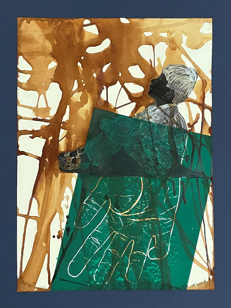 Pen on paper, coffee drip, lino printmaking, 16"x20"