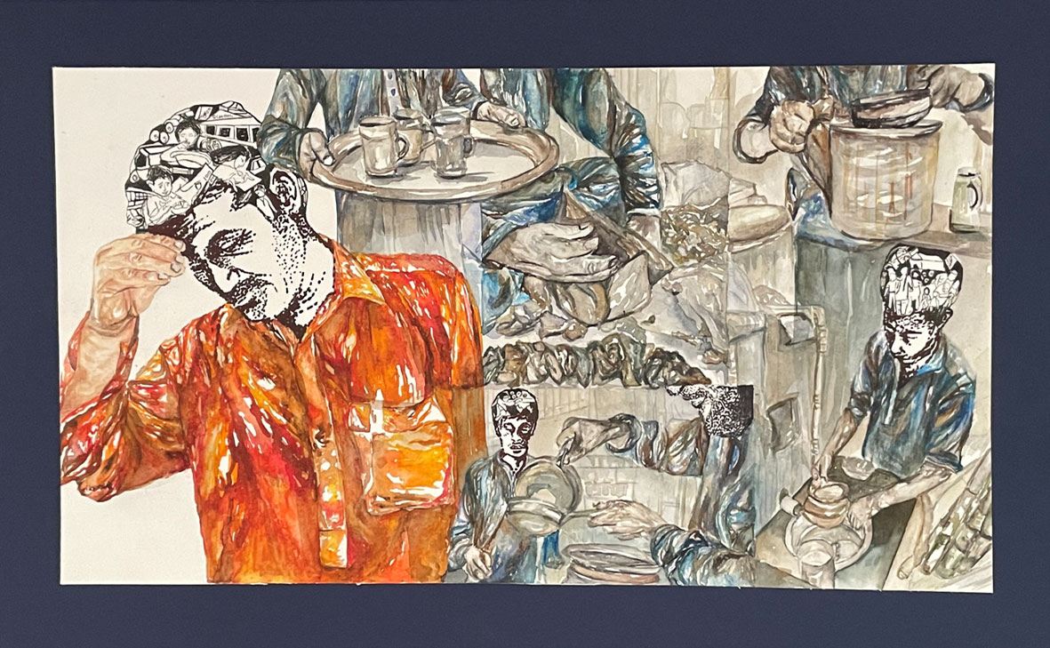 where the child is eating, going to school. I juxtaposed water colour with the use of black marker;